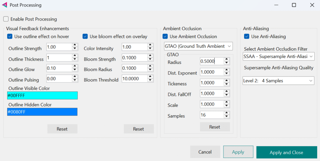 You can also toggle individual effects—such as Bloom, Outline, AO, or AA—separately within the Post Processing panel.